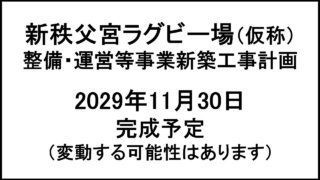 新店・開業 新秩父宮ラグビー場(仮称)整備・運営等事業新築工事計画 2029年11月30日完成予定|東京都新宿区 「新秩父宮ラグビー場(仮称)整備・運営等事業新築工事計画」が2029年11月30日(金)完成を予定しています。東京都新宿区霞ヶ丘町11ほか。計画では、地上8階、地下1階、延床面積:72500平方メートル、主要用途:観覧場、博物館、物品販売業を営む店舗、飲食店、自動車車庫。 2025.10.02 新店・開業